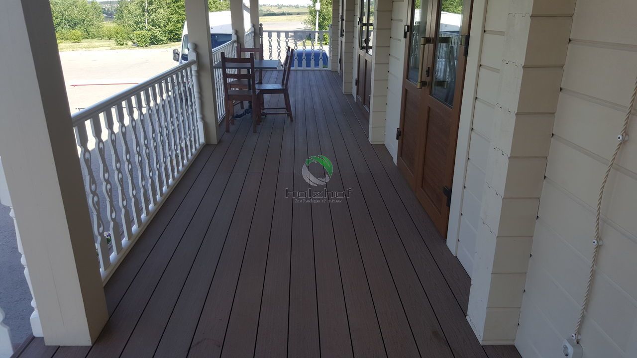 На агроусадьбе смонтирована террасная доска Holzhof с тиснением, которая отлично вписалась в общий интерьер, террасная доска будет долго и надежно служить и радовать посетителей, своим внешним видом и превосходным качеством.
